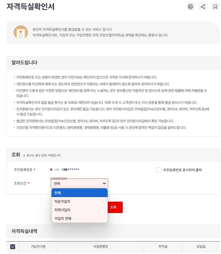 건강보험자격득실확인서 인터넷발급받을 때 몇 가지 유의사항이 있습니다